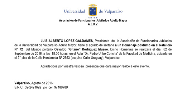 Luis Alberto López Galdames, Presidente de la Asociación de Funcionarios Jubilados de la Universidad de Valparaíso Adulto Mayor, tiene el agrado de invitarle a un Homenaje póstumo en el Natalicio N° 72 del Músico porteño Osvaldo “Gitano” Rodríguez Musso. Dicho Homenaje se realizará el día 02 de Septiembre de 2016, a las 18.00 horas, en el Aula “Dr. Pedro Uribe Concha” de la Facultad de Medicina, ubicada en el 2° piso de la Calle Hontaneda Nª 2653 (esquina Calle Uruguay), Valparaíso.