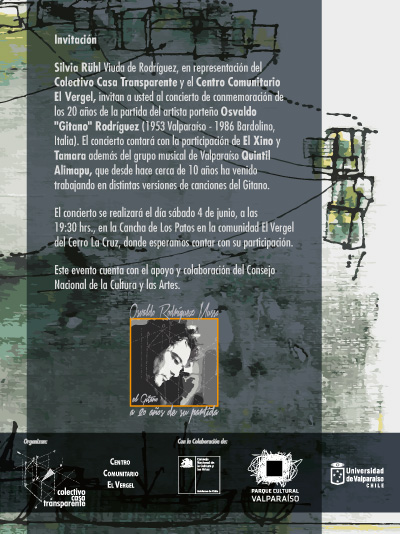 Silvia Rühl Viuda de Rodríguez, en representación del Colectivo Casa Transparente y el Centro Comunitario El Vergel, invitan a usted al concierto de conmemoración de los 20 años de la partida del artista porteño Osvaldo "Gitano" Rodríguez (1953 Valparaíso - 1986 Bardolino, Italia). El concierto contará con la participación de El Xino y Tamara además del grupo musical de Valparaíso Quintil Alimapu, que desde hace cerca de 10 años ha venido trabajando en distintas versiones de canciones del Gitano.