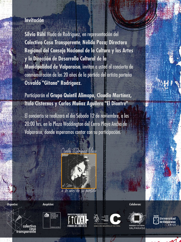 Silvia Rühl Viuda de Rodríguez, en representación del Colectivo Casa Transparente, Nélida Pozo; Directora Regional del Consejo Nacional de la Cultura y las Artes y la Dirección de Desarrollo Cultural de la Municipalidad de Valparaíso, invitan a usted al concierto de conmemoración de los 20 años de la partida del artista porteño Osvaldo "Gitano" Rodríguez.
