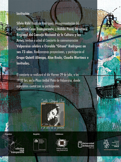 Silvia Rühl Viuda de Rodríguez, en representación del Colectivo Casa Transparente, y Nélida Pozo; Directora Regional del Consejo Nacional de la Cultura y las Artes, invitan a usted al Concierto de conmemoración Valparaíso celebra a Osvaldo "Gitano" Rodríguez en sus 73 años. Realizaremos proyecciones, y participarán el Grupo Quintil Alimapu, Alan Reale, Claudio Martínez e Invitados.